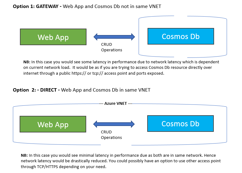 After carefully analyzing different options available within Cosmos Db SQL API’s have realized there are different aspects we could optimize in achieving minimal turn around time. In this article I am going to discuss about one such useful find, that is to use Cosmos Db SQL SDK connection policy to use diferent networking options to improve the latency between web application and cosmos db API calls.