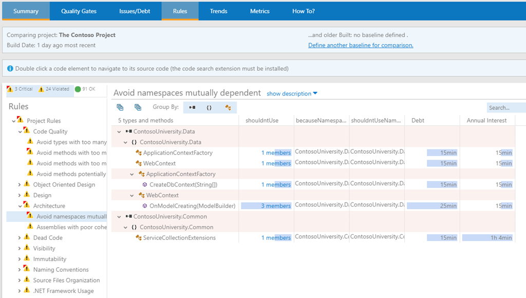 Now you go back to NDepend menu from Left side menu item in Summary Tab. This will provide you detailed view of Technical Debt in your project.