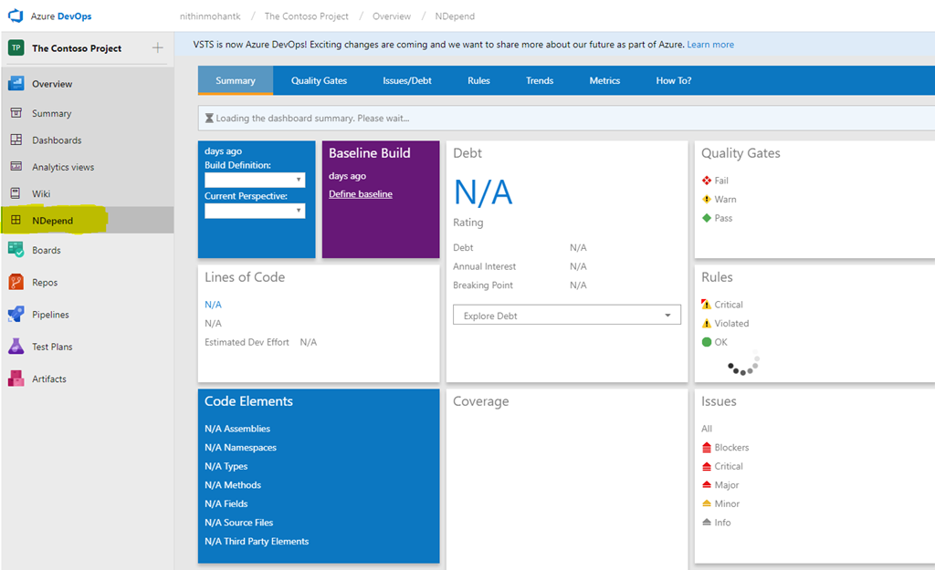 3.) Now when you get back to Azure DevOps project, you can see the NDepend side menu enabled, this is where you would see the report summary of your project.