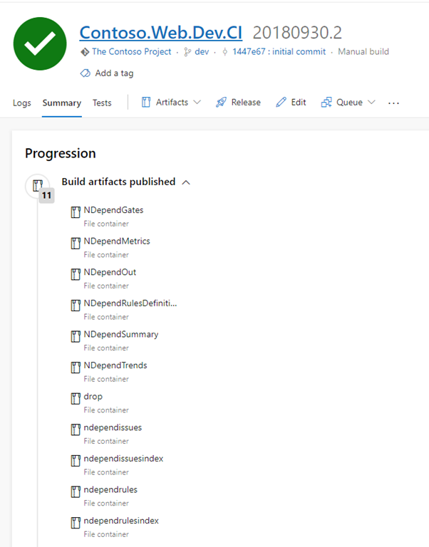 Queue a new Build and wait for Build to complete. Now you can see the BuildArtifacts includes all NDepend report file.