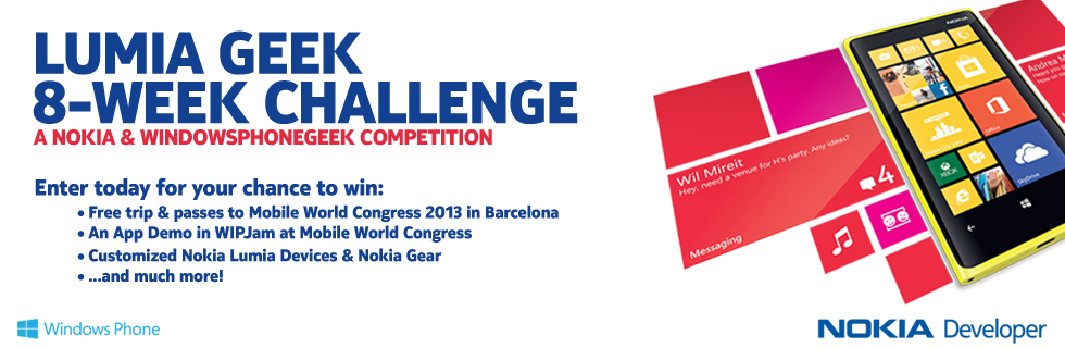 To celebrate the launch of the Lumia 920 and 820 devices, Windows Phone Geek and Nokia are offering awesome prizes for developers in the Lumia Geek 8 Week Challenge.