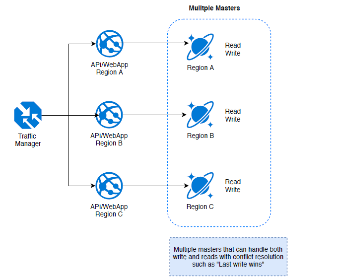 Multi-master is a capability that provided as part of Cosmos DB, that would provide you multiple write regions and provides an option to handle conflict resolution automatically through different options provided by the platform. Most of the major scenarios you would encounter the conflict can be resolved with these simple configurations.