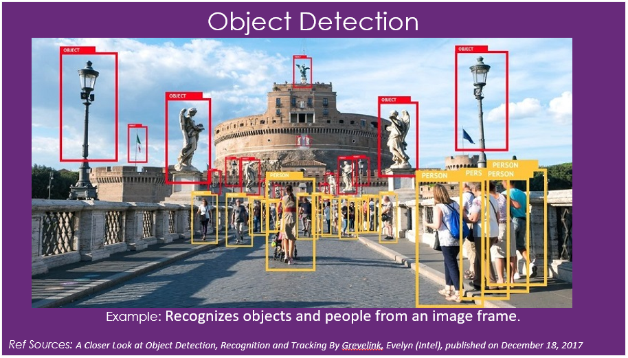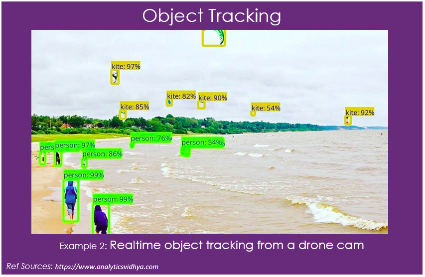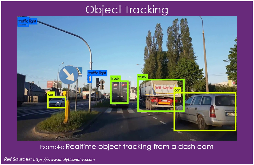 4.) Object Tracking: Done in motion pictures like in animated gifs or videos, we want to track how an object is moving, where is it going, or its speed. For example: vehicle tracking in a traffic camera system.Or a Realtime object or people tracking like in Object Detection figure.